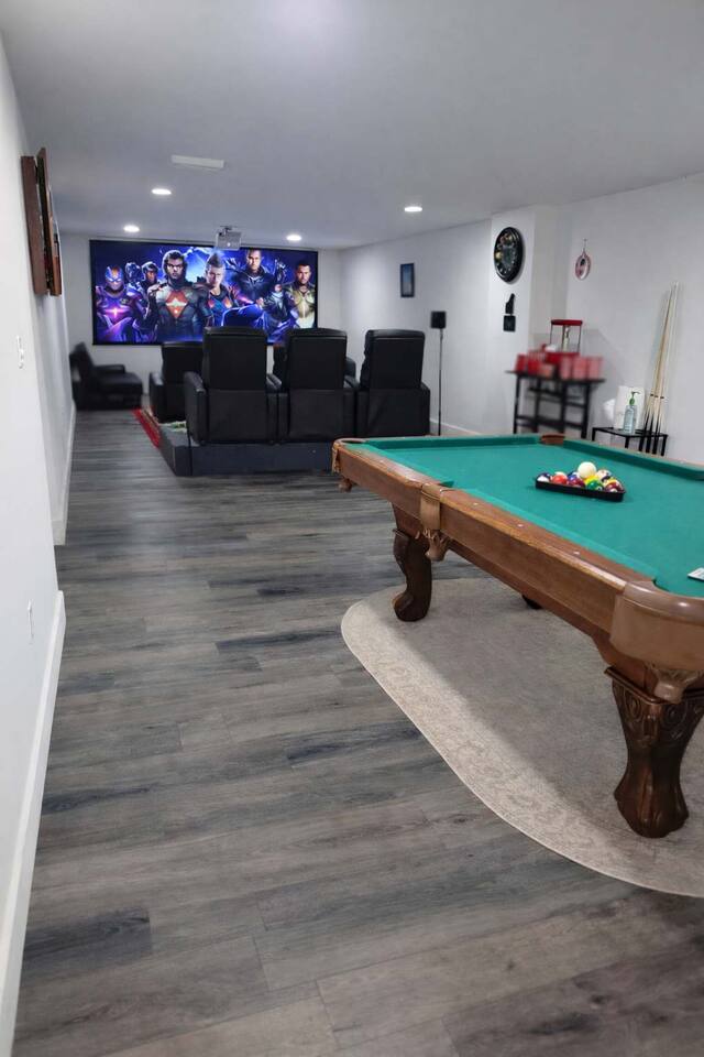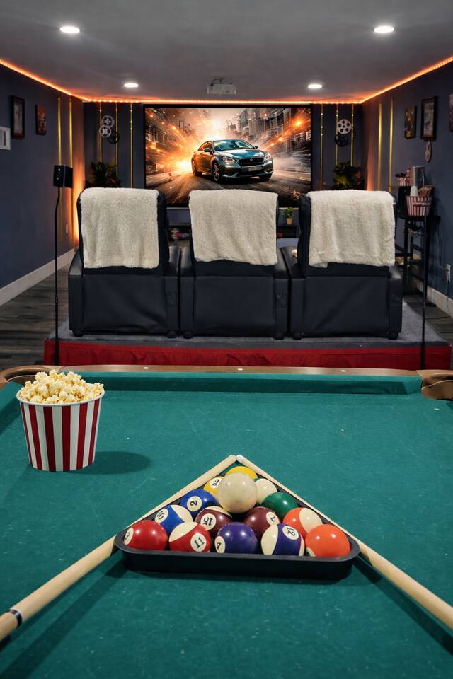 Movie Theater Home • 3BR • Sleeps 8 • Near Indy Relax in this peaceful 3-bedroom entertainment home with a private movie theater, pool table, and game room. The home features two bedrooms with twin beds and a large master bedroom with king bed and private bath. Enjoy a 55” Smart TV, fully equipped kitchen, and dining space. Downstairs offers surround sound theater seating and games. Step outside to a private patio with seating and grill. Located 15–20 min from Downtown Indianapolis.